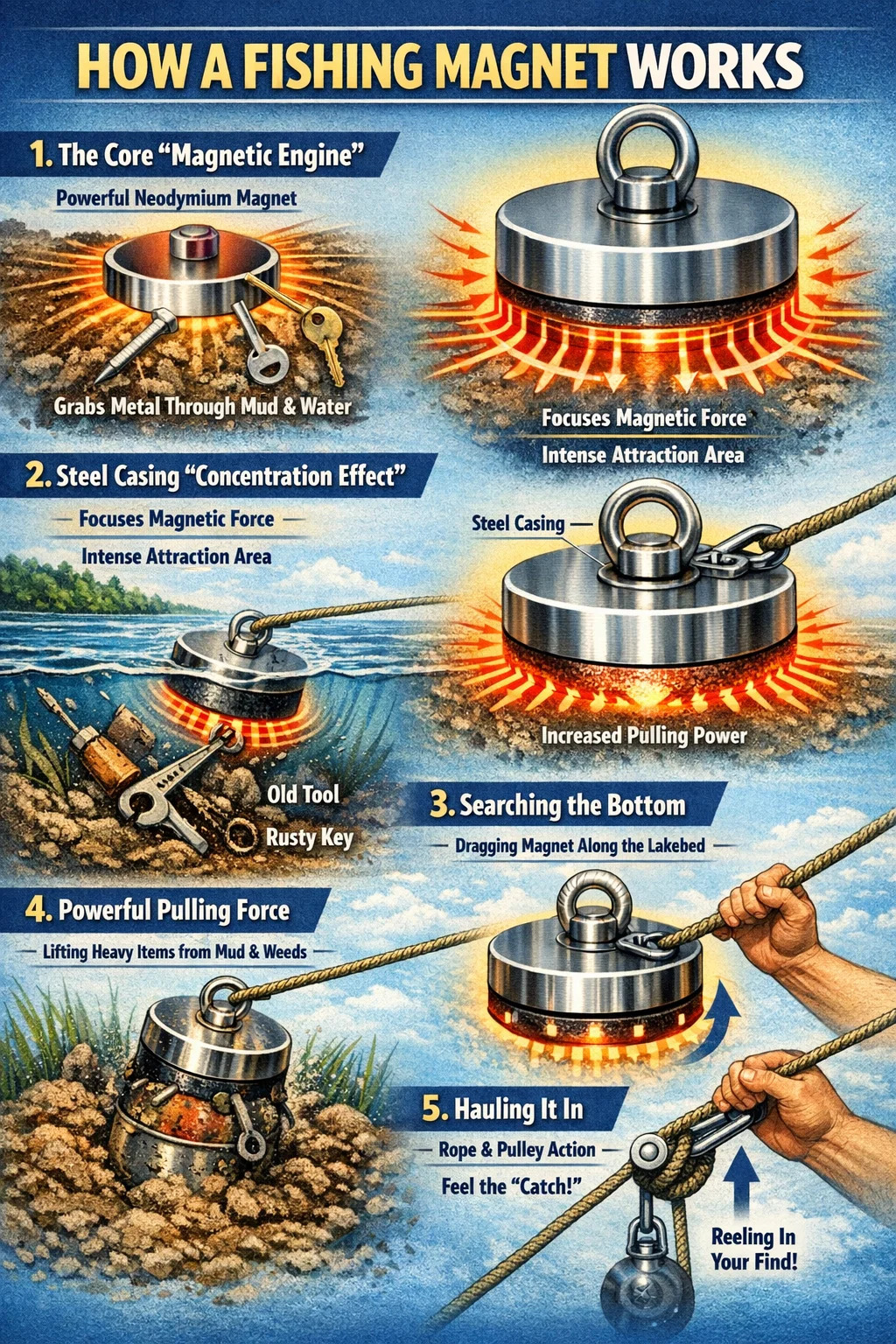 Upang maunawaan kung paano a pangingisda magnet gumagana, maaari mong isipin ito bilang isang super-powered na "underwater vacuum cleaner," maliban sa alikabok, sinisipsip nito ang metal.