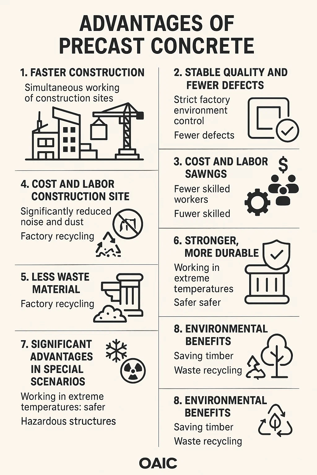 Mas kaunting mga bihasang manggagawa na kinakailangan: ang trabaho sa site na pangunahin ay nagsasangkot ng pag-hoisting, pagbabawas ng pangangailangan para sa malawak na gawa ng karpintero at pagmamason, sa gayon ang pagbaba ng mga gastos sa paggawa.