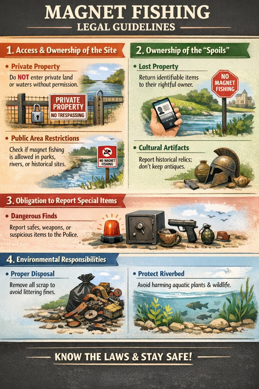 Bago makisali sa magnet fishing, mahalagang maunawaan ang mga nauugnay na batas at regulasyon. Bagama't ang aktibidad na ito ay itinuturing na isang positibong paraan upang linisin ang kapaligiran sa maraming lugar, ayon sa batas, ito ay nagsasangkot ng iba't ibang aspeto tulad ng mga karapatan sa lupa, pagmamay-ari ng mga nakuhang bagay, at kaligtasan ng publiko.