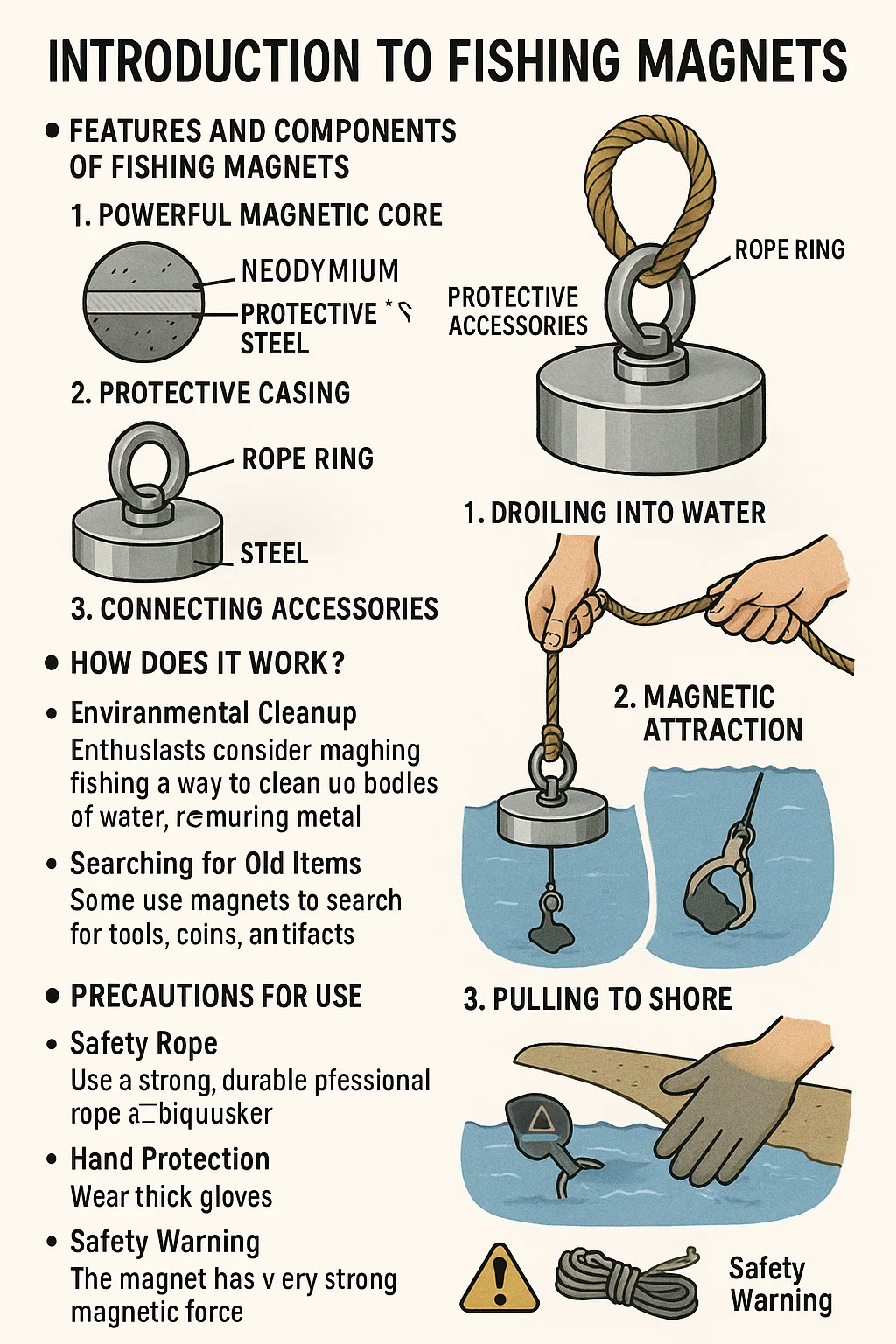 Paglilinis ng Kapaligiran: Maraming mga mahilig ang isaalang -alang ito upang linisin ang mga katawan ng tubig at protektahan ang kapaligiran, hinila ang mga itinapon na mga fragment ng metal, mga frame ng bisikleta, gulong rims, at iba pang basura ng metal. Naghahanap ng mga lumang item: Minsan ang mga tao ay gumagamit ng mga magnet upang maghanap at makuha ang mga lumang tool, barya, bahagi, at iba pang mga artifact sa kasaysayan na naiwan o inabandona sa tubig.