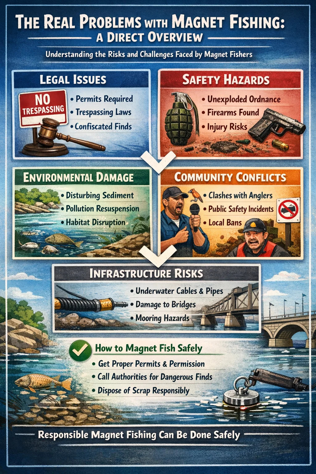 Ang pinakakaraniwang problemang kinakaharap ng mga mangingisda ng magnet ay ang legal na problema — kadalasan dahil hindi nila napagtanto na kailangan ng permit o pahintulot bago nila ihulog ang kanilang pangingisda sa tubig. Ang legal na tanawin ay kapansin-pansing nag-iiba ayon sa bansa, rehiyon, at maging sa indibidwal na daluyan ng tubig, na lumilikha ng tagpi-tagping mga panuntunan na madaling labagin nang hindi sinasadya.